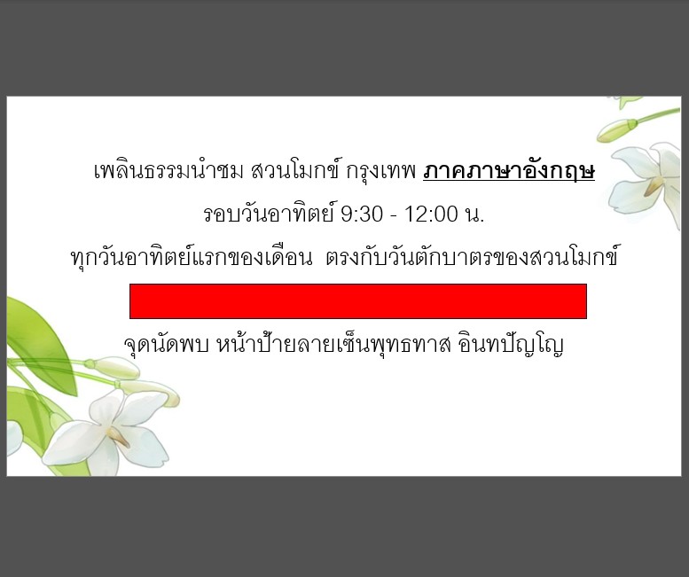 เพลินธรรมนำชม สวนโมกข์ กรุงเทพ ภาคภาษาอังกฤษ รอบวันอาทิตย์ 9:30 – 12:00 น. ทุกวันอาทิตย์แรกของเดือน ตรงกับวันตักบาตรของสวนโมกข์
